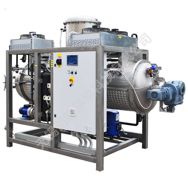 本公司低溫?zé)岜媒Y(jié)晶器通過壓縮機(jī)作用于冷媒,獲得高溫高壓工質(zhì)氣體,經(jīng)過冷凝器工質(zhì)氣體放熱液化,冷卻得到工質(zhì)液體,同時(shí)將熱量傳給了物料,使物料中的水分汽化,與物料分離,在蒸發(fā)器頂部經(jīng)冷凝成冷卻水通過冷凝水排水裝置排出,冷凝后的工質(zhì)液體通過減壓再次氣化,在蒸發(fā)器中吸收由物料中的水分汽化產(chǎn)生的水蒸汽的熱量,經(jīng)壓縮機(jī)的吸入再壓縮,如此循環(huán)工作。